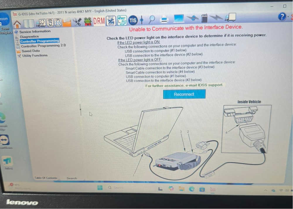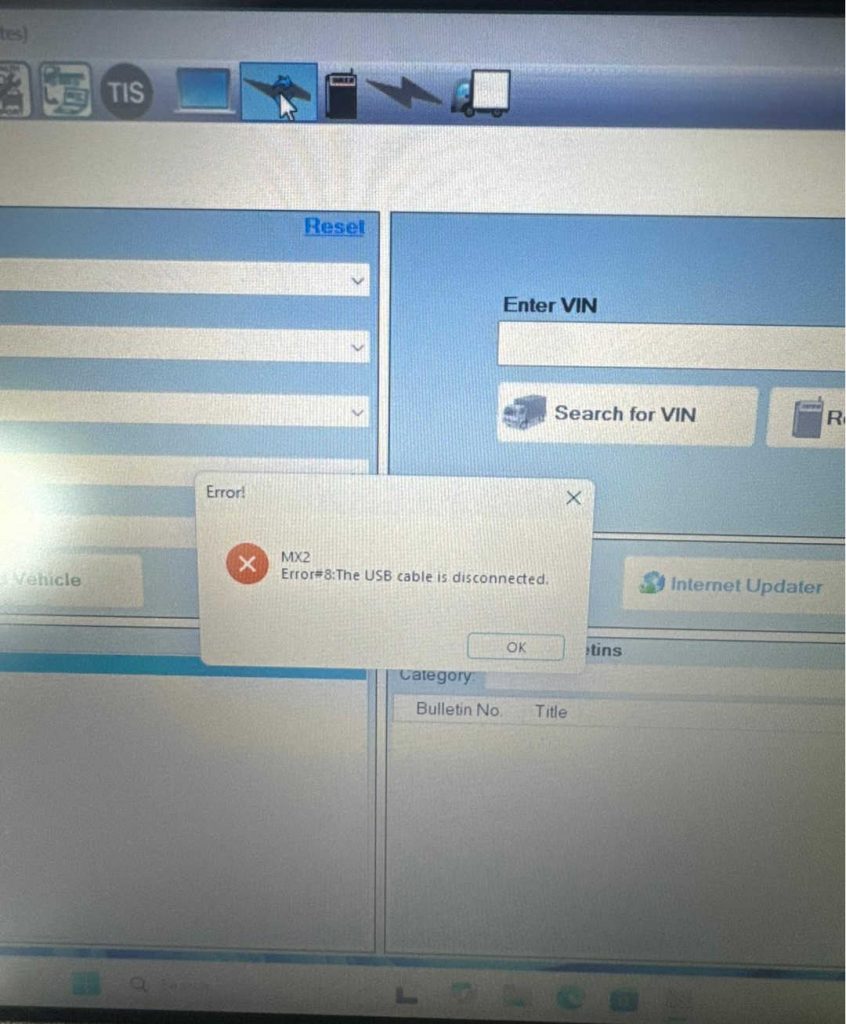 After we installed the Isuzu G-IDSS Software on the customer’s laptop, he said the software appear the issue “MX2 Error#8: The USB cable is disconnected” and “Unable to Communicate with the Interface Device.”