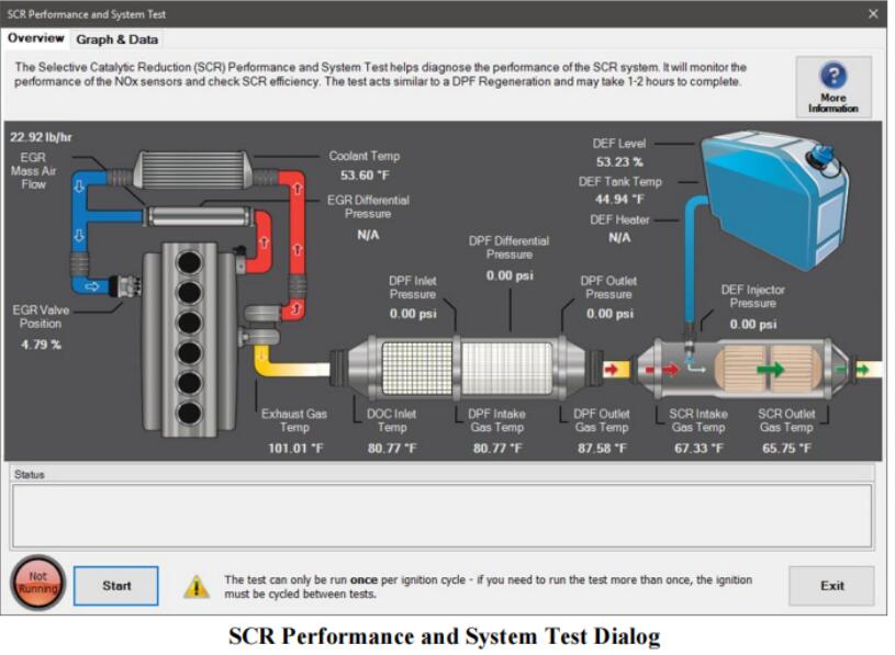 The SCR Performance and System Test helps technicians diagnose issues related to the SCR system’s performance. It evaluates NOx sensor function and SCR system efficiency, ensuring compliance with emissions standards.